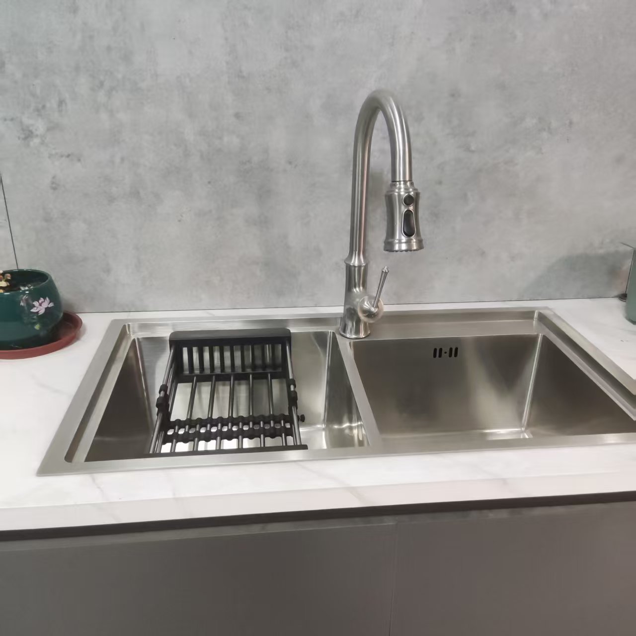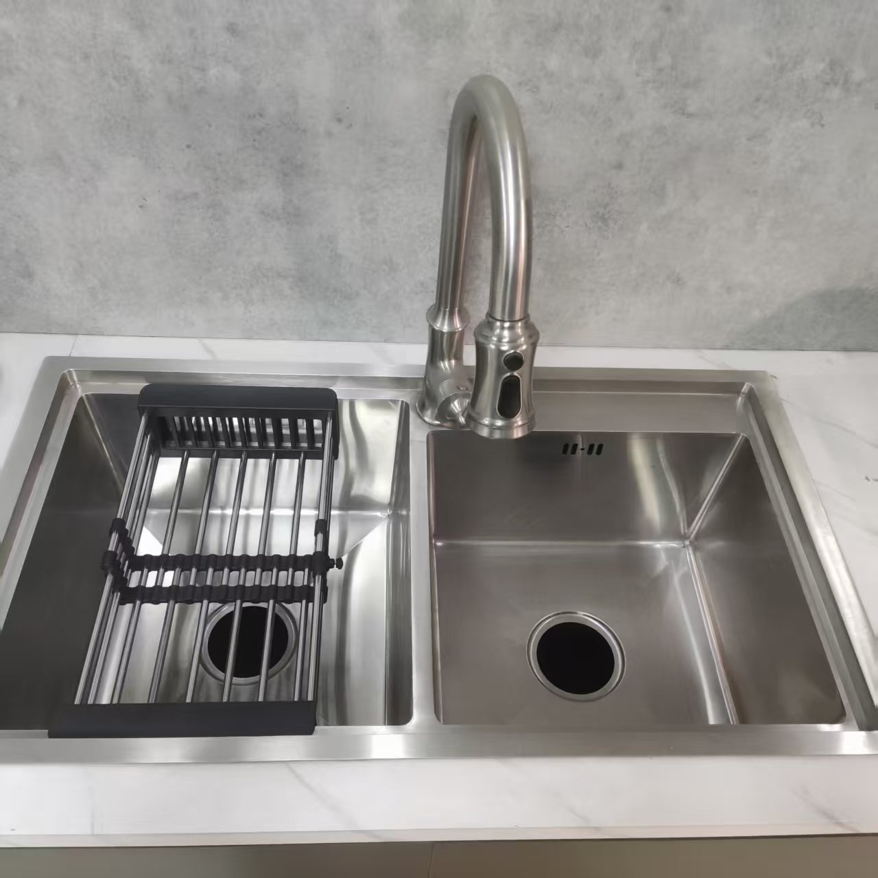 | Évier de cuisine à double cuve avec robinet à arc élevé | 900×550×230 mm | Sortie d'eau à grand angle |